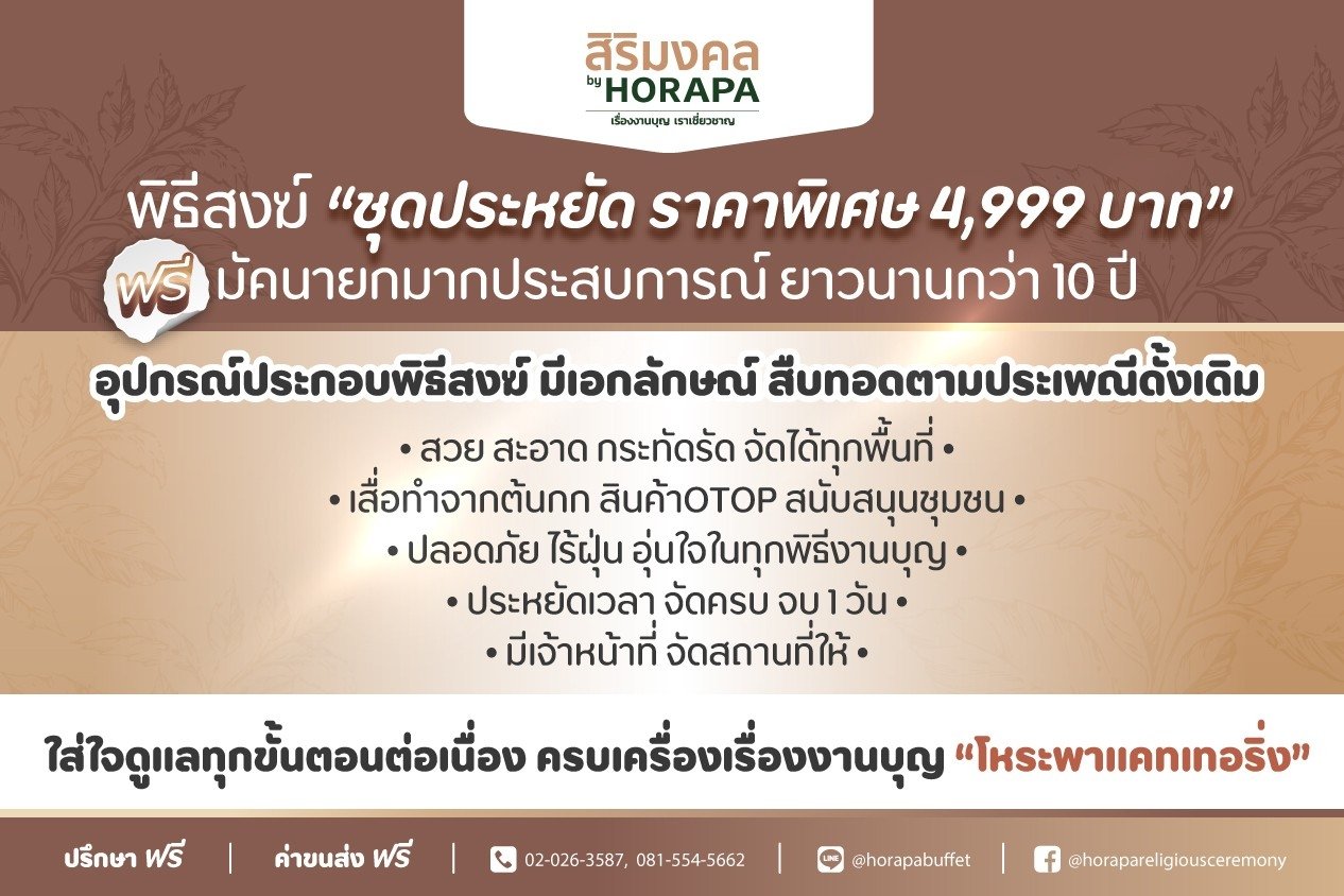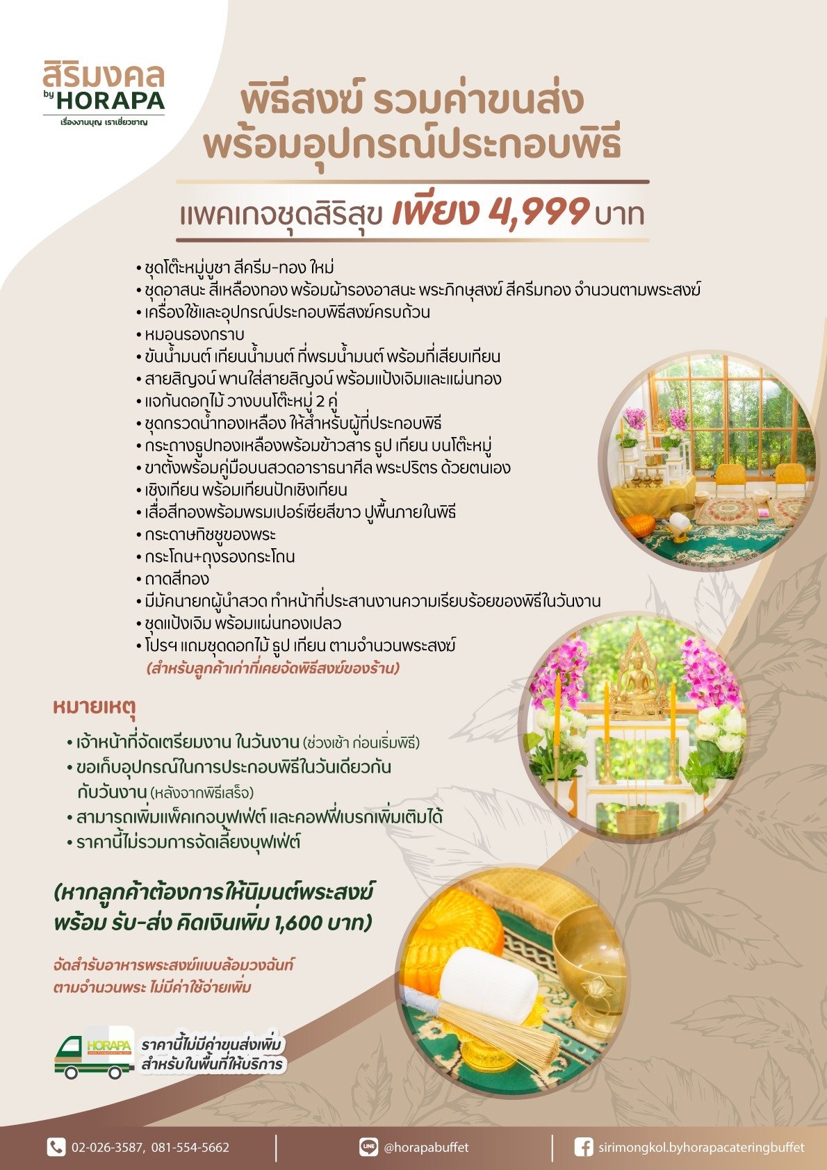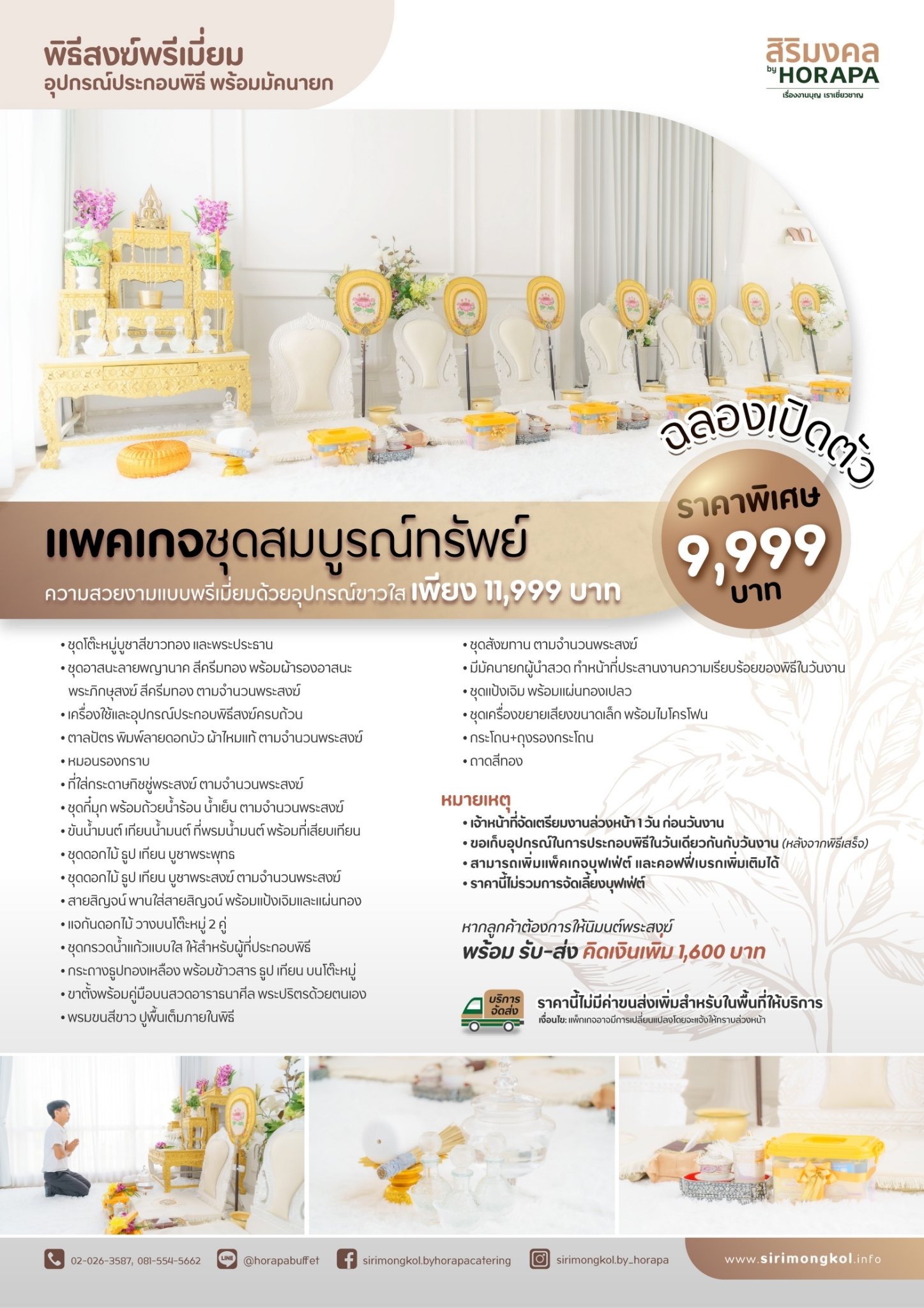 สิริมงคล by โหระพาแคทเทอริ่ง รับจัดทำบุญบ้าน เพียงราคา 4,499 บาท "เรื่องงานบุญ...เราเชี่ยวชาญ กับประสบการณ์ด้านพิธีสงฆ์มากกว่า 10 ปี การันตีจากจำนวนงานที่มากกว่า 10,000 งาน ทุกแพคเกจงานบุญเรามีมัคนายกและมัคนายิกาที่มีความรู้ พร้อมให้คำแนะนำทุกพิธีการแบบมืออาชีพ" รับจัดทำบุญบ้าน รับจัดงานพิธีสงฆ์ครบวงจร อุปกรณ์ในการประกอบพิธีครบ โต๊ะหมู่บูชา พรม อาสนะ สีครีมทองเรียบหรู ดูดี สะอาด ไม่ว่าจะเป็น งานบุญ งานพิธีต่างๆ โหระพาแคทเทอริ่งมีบริการทุกรูปแบบ อุปกรณ์ผ่านการฆ่าเชื้อ ปลอดภัย ไร้เชื้อโควิด เลี้ยงพระฉันแยก บริการโดยพนักงานมืออาชีพ สะดวก ครบครัน ไปพร้อมกับ บุพเฟต์ อาหารหลากหลาย ราคาถูก สุดคุ้ม เพียง 99 บาทต่อท่าน ลูกค้าการันตีรสชาติความอร่อย รับจัดงานพิธี รับจัดงานบุญออฟฟิศ ทำบุญออฟฟิศ ทำบุญโรงงาน ทำบุญครบรอบ 100 วัน นึกถึงงานบุญ นึกถึงโหระพา ใครๆ ก็สามารถทำบุญได้ โหระพา คือต้นแบบการจัดเลี้ยง แบบครบวงจร เป็นเจ้าแรก ของประเทศไทย โหระพาบริการด้วยใจใส่ใจคุณลูกค้าเปรียบเสมือนครอบครัวเดียวกัน