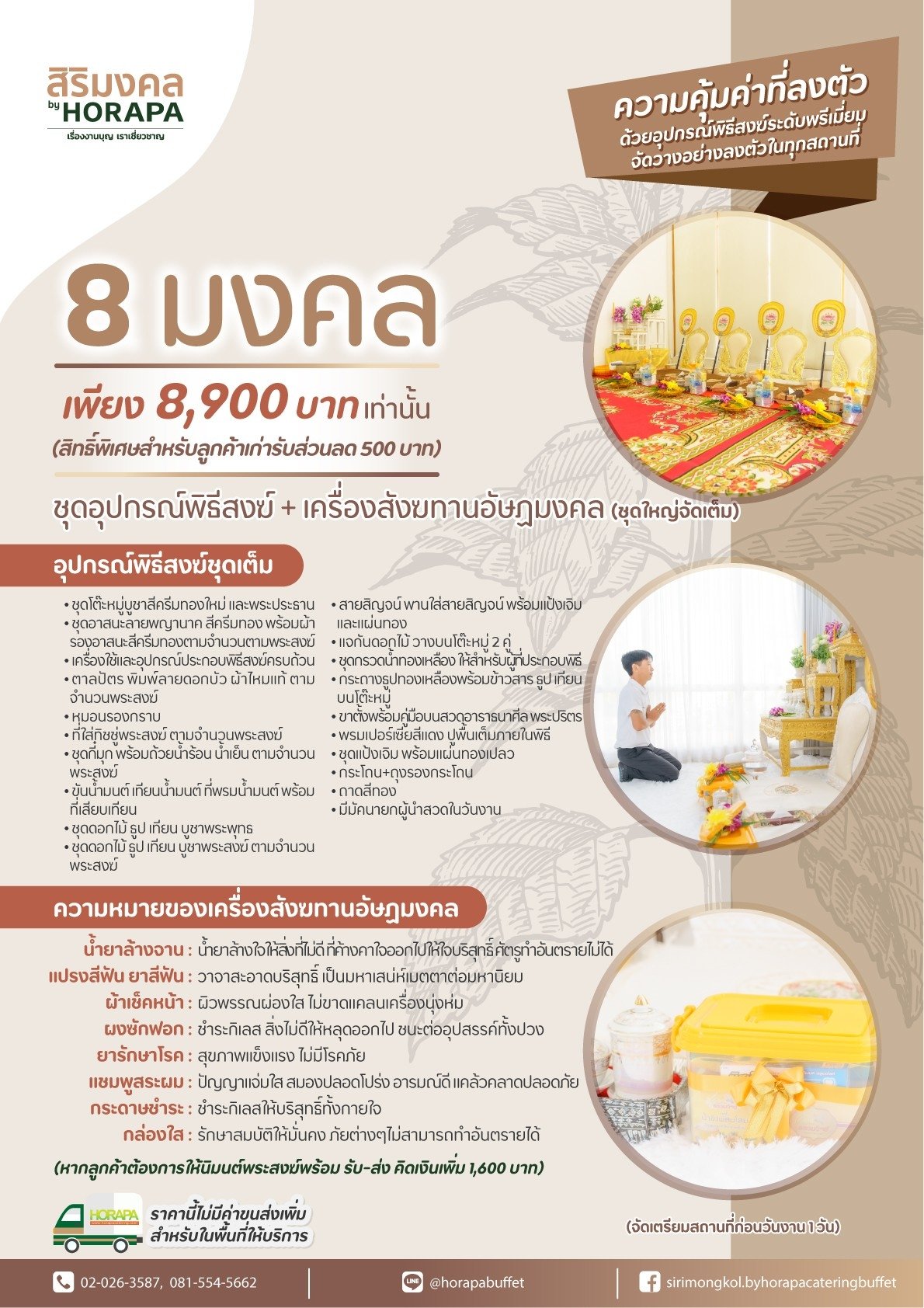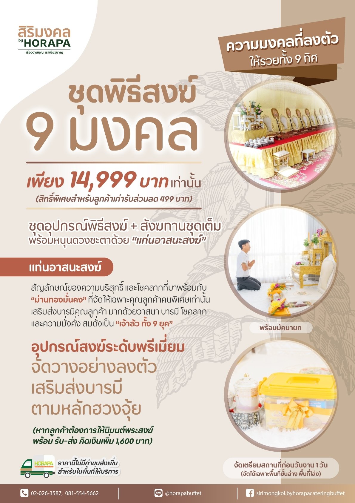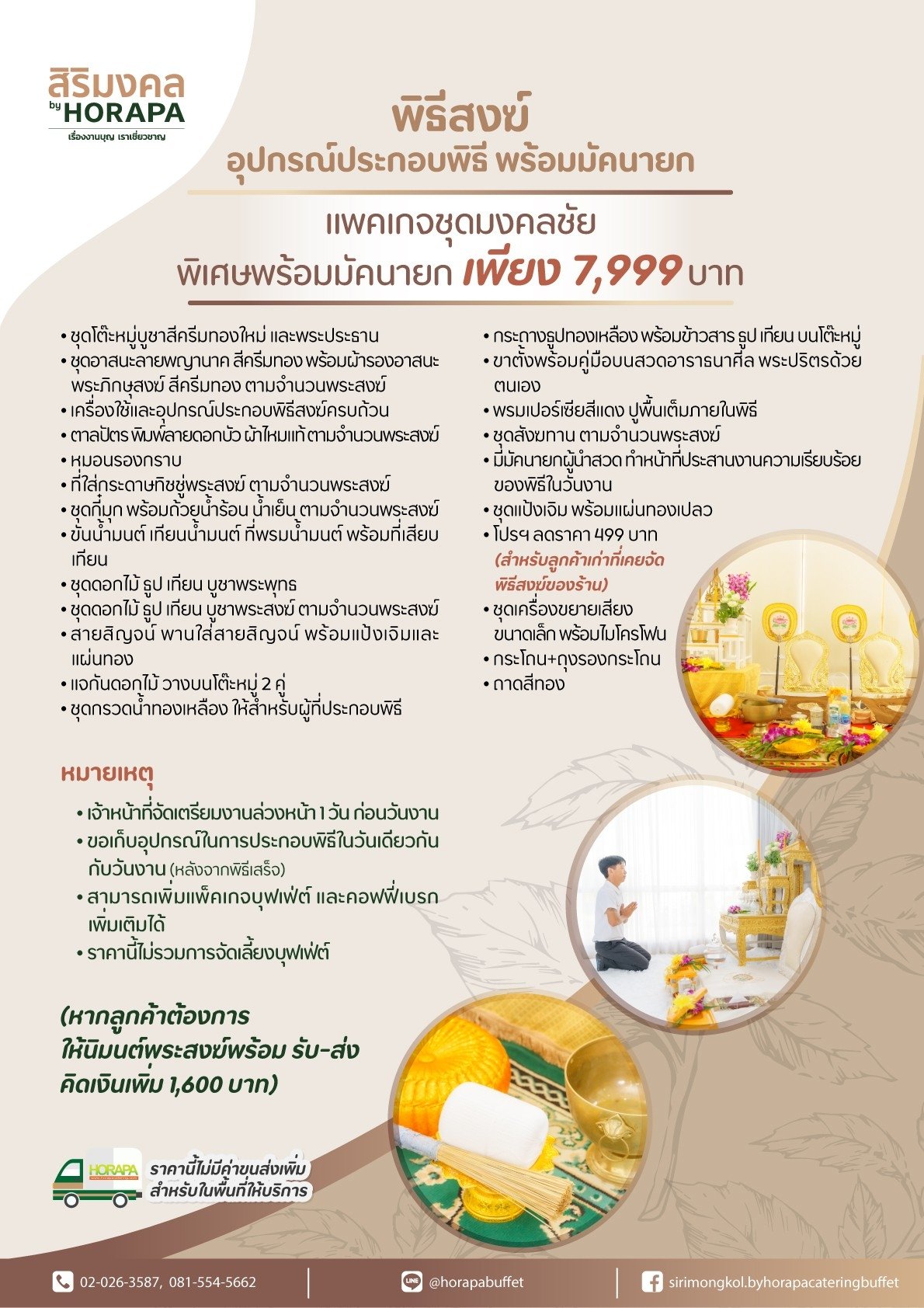 สิริมงคล by โหระพาแคทเทอริ่ง รับจัดทำบุญบ้าน เพียงราคา 4,499 บาท "เรื่องงานบุญ...เราเชี่ยวชาญ กับประสบการณ์ด้านพิธีสงฆ์มากกว่า 10 ปี การันตีจากจำนวนงานที่มากกว่า 10,000 งาน ทุกแพคเกจงานบุญเรามีมัคนายกและมัคนายิกาที่มีความรู้ พร้อมให้คำแนะนำทุกพิธีการแบบมืออาชีพ" รับจัดทำบุญบ้าน รับจัดงานพิธีสงฆ์ครบวงจร อุปกรณ์ในการประกอบพิธีครบ โต๊ะหมู่บูชา พรม อาสนะ สีครีมทองเรียบหรู ดูดี สะอาด ไม่ว่าจะเป็น งานบุญ งานพิธีต่างๆ โหระพาแคทเทอริ่งมีบริการทุกรูปแบบ อุปกรณ์ผ่านการฆ่าเชื้อ ปลอดภัย ไร้เชื้อโควิด เลี้ยงพระฉันแยก บริการโดยพนักงานมืออาชีพ สะดวก ครบครัน ไปพร้อมกับ บุพเฟต์ อาหารหลากหลาย ราคาถูก สุดคุ้ม เพียง 99 บาทต่อท่าน ลูกค้าการันตีรสชาติความอร่อย รับจัดงานพิธี รับจัดงานบุญออฟฟิศ ทำบุญออฟฟิศ ทำบุญโรงงาน ทำบุญครบรอบ 100 วัน นึกถึงงานบุญ นึกถึงโหระพา ใครๆ ก็สามารถทำบุญได้ โหระพา คือต้นแบบการจัดเลี้ยง แบบครบวงจร เป็นเจ้าแรก ของประเทศไทย โหระพาบริการด้วยใจใส่ใจคุณลูกค้าเปรียบเสมือนครอบครัวเดียวกัน